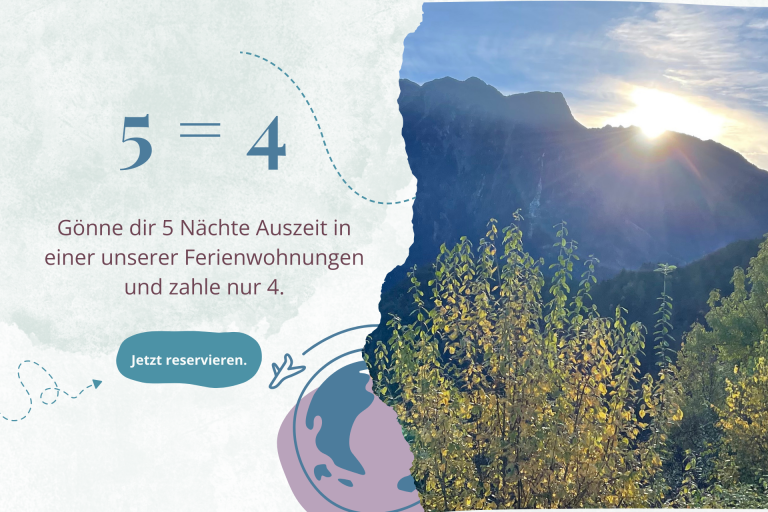 Bei einem Aufenthalt von 5 Nächten schenken wir dir Eine. 5 Nächte buchen und nur 4 bezahlen! Dieses Angebot ist gültig vom 07.09. - 03.10.2024